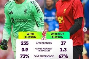 英超官方盘点阿利森缺战时利物浦数据,场均丢球增加0.4球