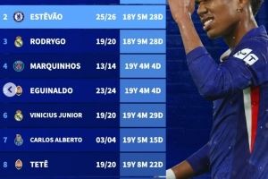 体育资讯10月23日讯 在本轮欧冠切尔西5-1大胜阿贾克斯的比赛中,埃斯特旺破门。德转也盘点了欧冠改制以来巴西最年轻进球球员榜单,具体如下: